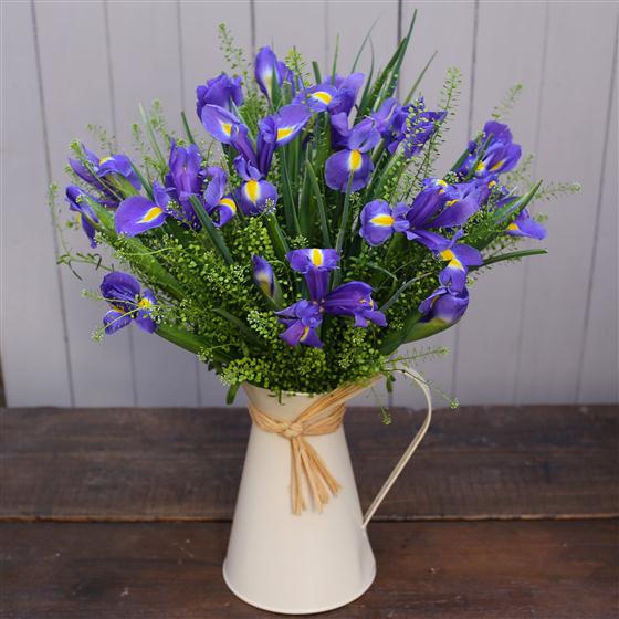 A ceramic jug filled with 20 beautiful blue Iris and seasonal foliage.please note iris will be delivered in bud for longevity