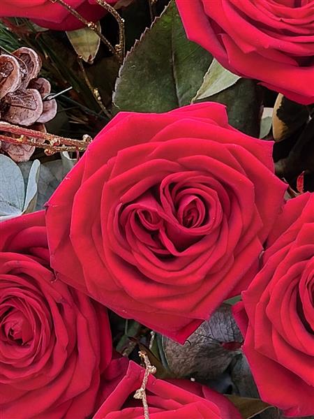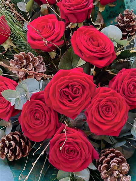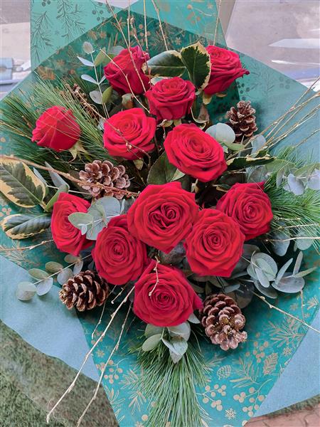 12 GORGEOUS LUXURIOUS RED ROSES WITH JUST THE RIGHT AMOUNT OF cHRISTMAS SPARKLE ,FINISHED WITH FESTIVE FOLIAGE AND CONES