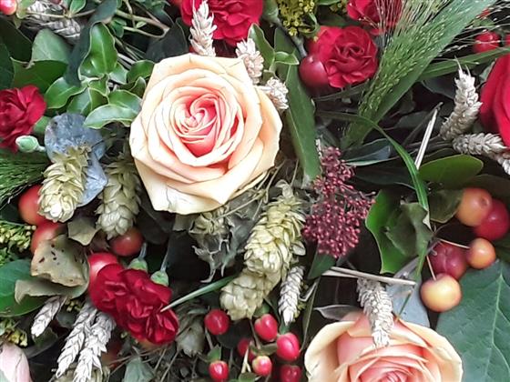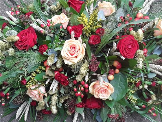 A beautiful tribute for someone who loved the country featuring Rose's hops wheat rosehips.A snapshot of all things country.image pictured is a 3 foot tribute