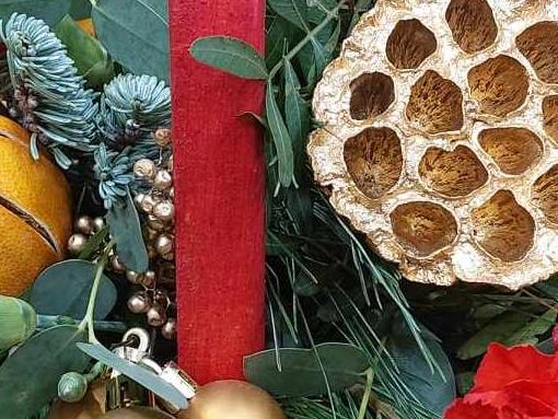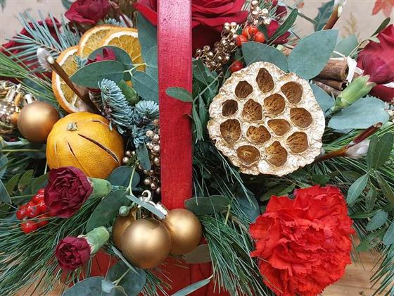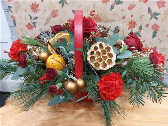 Traditional Christmas basket filled with wonderful fragrant foliage,roses,carnations,gold lotus heads,oranges, cinnamon and just a touch of rich copper sparkle and red berries